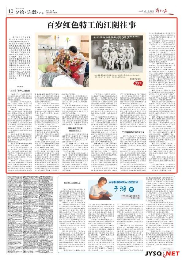12月5日 《解放日報》登載文章 講述了百歲紅色特工的江陰往事 一起來關注!